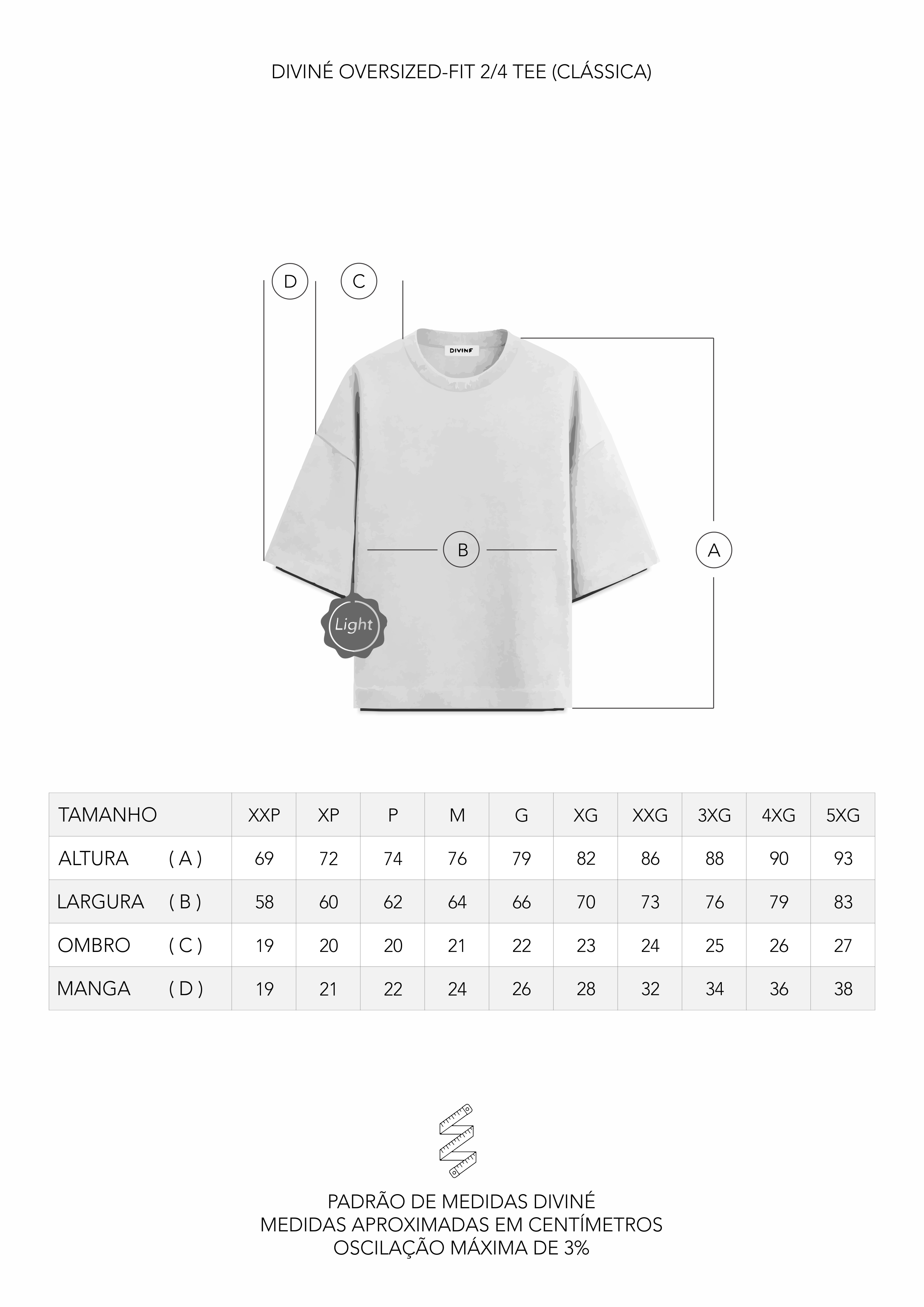 A Diviné entendeu perfeitamente o conceito de camiseta oversized. A Prova disto é essa imponente camiseta apresentada aqui com um tecido ultra encorpado que remete potência e maestria no caimento perfeito que uma over deveria oferecer. Um peça coringa para meia estação. simultaneamente discreta e barulhenta está camiseta over vai te colocar em um patamar de respeito.